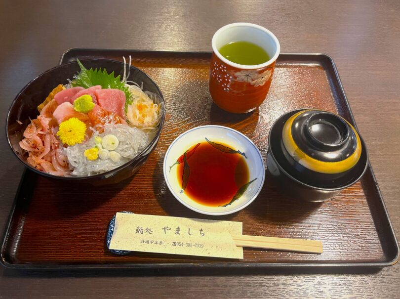 鮨処やましちは駿河湾で獲れた桜えびのかき揚げ丼やしらすが乗った海鮮丼が食べられます。