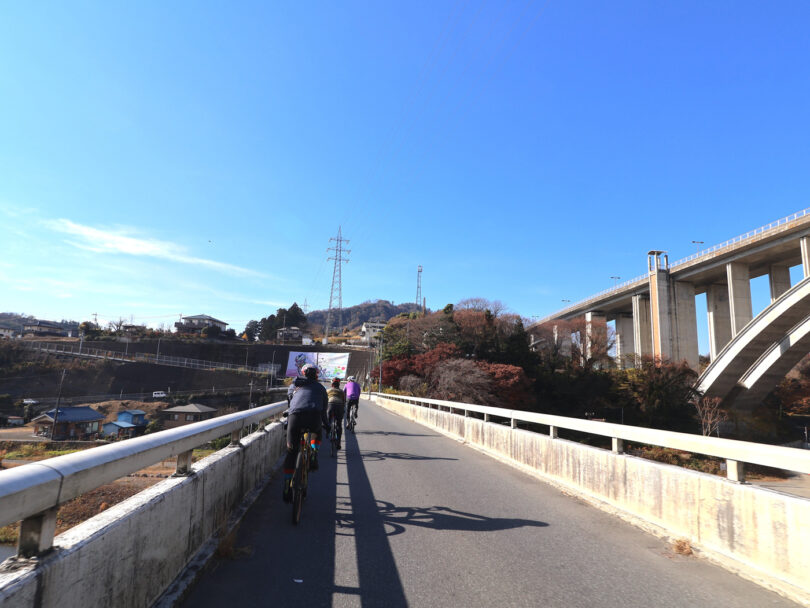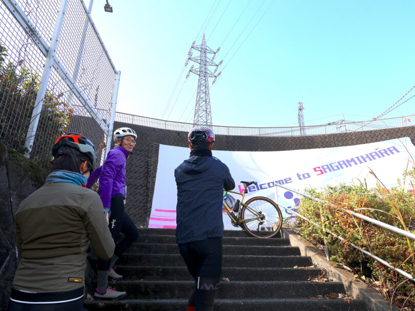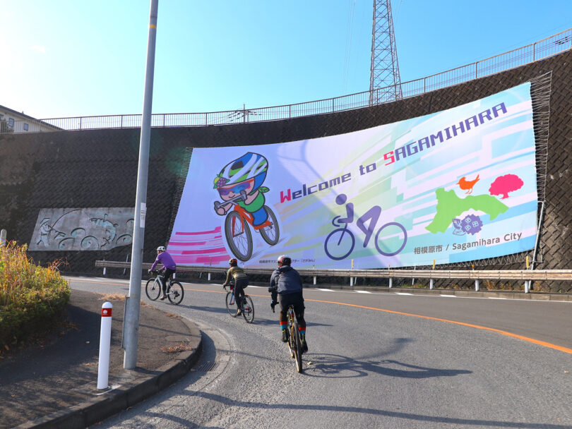 オギノパンCAFEを4人で出発、住宅街をしばらく走ると相模川にかかる小倉橋へ。ここを渡るとさっそく見えてきたのは特大のバナー。そう、ここはオリンピックのTOKYO2020で男女ロードレースのコースとなった道。オリンピック当時のものから数えて4つめの絵柄となったウェルカムバナーが迎えてくれました。「おおー、これかあ!」と思わず声が出ます。