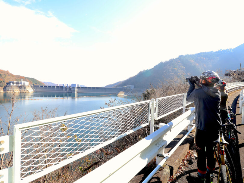 オギノパンを後にして次に目指すのは宮ヶ瀬湖。トンネルを抜けると豊富な水量をたたえる宮ヶ瀬湖が眼前に広がります。この宮ヶ瀬湖は宮ヶ瀬ダムによるダム湖で、完成は2000年。湖畔には観光施設や広い駐車場があり、観光客に人気のスポット。もちろんこのあたりを走るサイクリストの聖地でもあります。