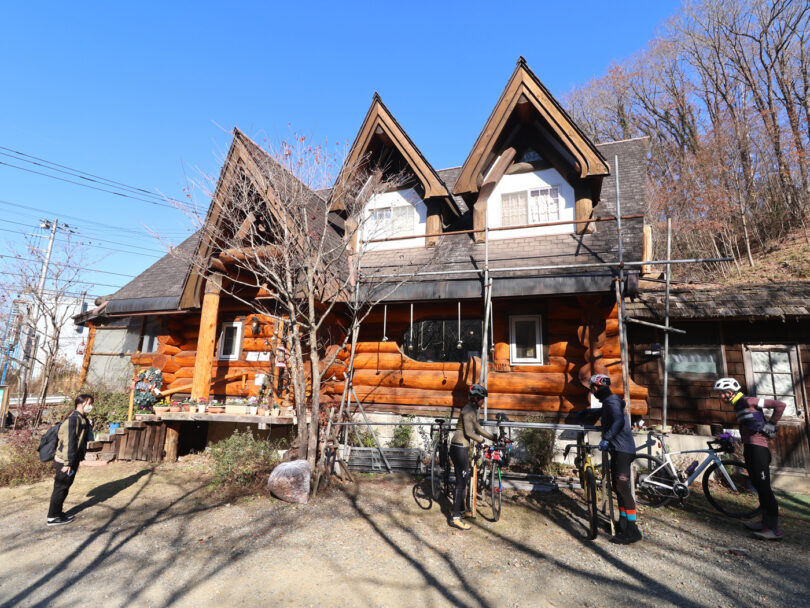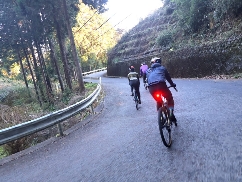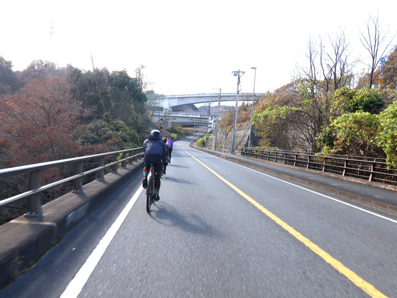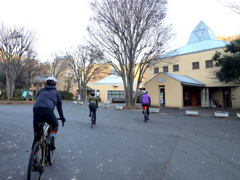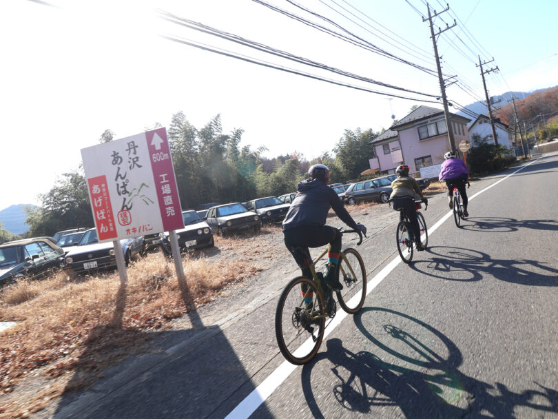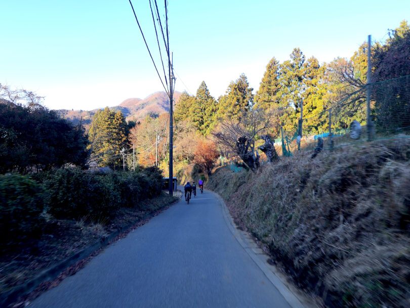 ランチとコーヒーでエネルギー充電したところで、今日の宿泊場所に向けてぐんぐん走っていきます。国道413号を、バカンス村という観光施設の看板を目印に右折。ここから交通量の少ない里山の道を上っていきます。ガイドの佐藤さんは相模原市に住んでいたこともあり、このへんの歴史や地理にも詳しく、ところどころでしてくれる解説がとてもおもしろい。