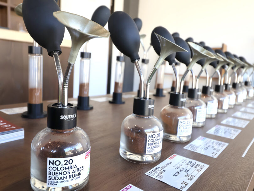 こんなふうに香りをかいで自分の好みの豆と焙煎を選んで注文できます。全部やりたくなるので注文するまでに時間がかかります