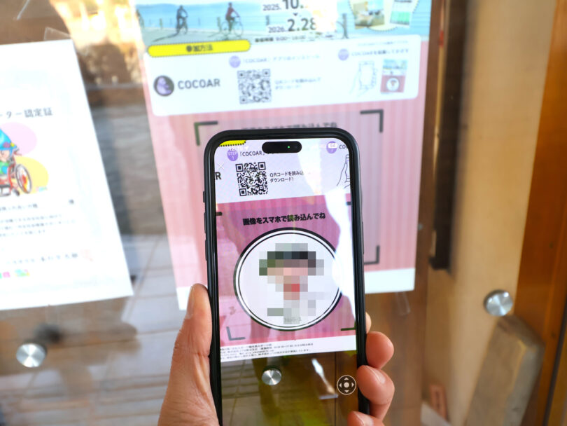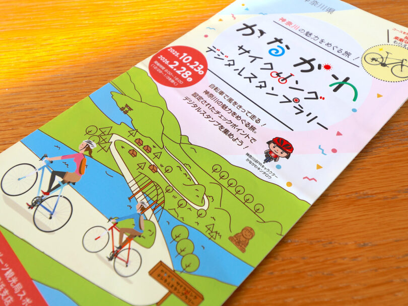 専用アプリ「COCOAR」をダウンロードしてチェックポイントで「かながわキンタロウ」(神奈川県PRキャラクター)のマークを読み取ってデジタルスタンプをゲットします。県内6コースのそれぞれ4ポイントでスタンプをゲット、全スタンプを集めた人のなかから抽選でメリダのクロスバイクや温泉のペア宿泊券がもらえます。全部集めたくなります