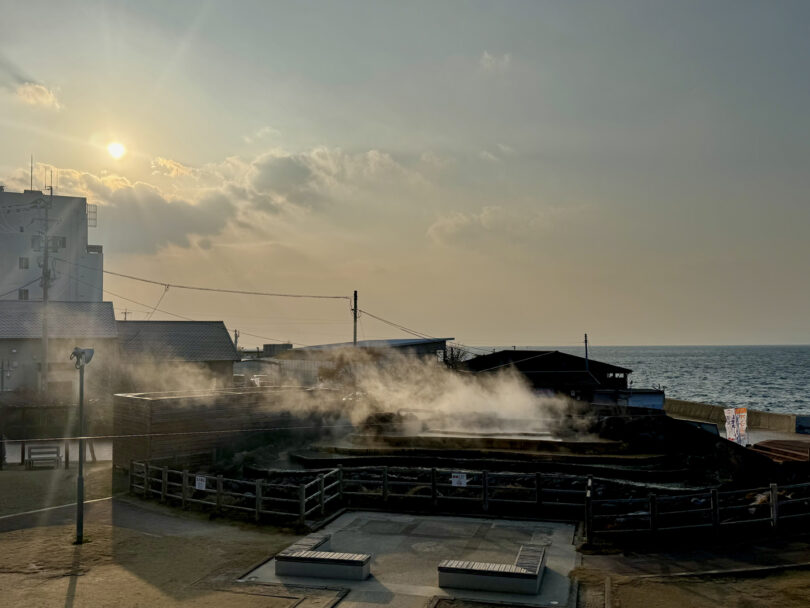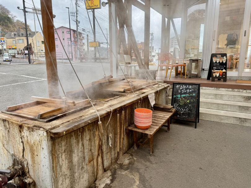 夕暮れ時には橘湾に沈む美しい夕日を眺めながら足湯を楽しめ、併設の「蒸し釜」や周辺のお店では、温泉の蒸気で卵や野菜を蒸して食べることができます。