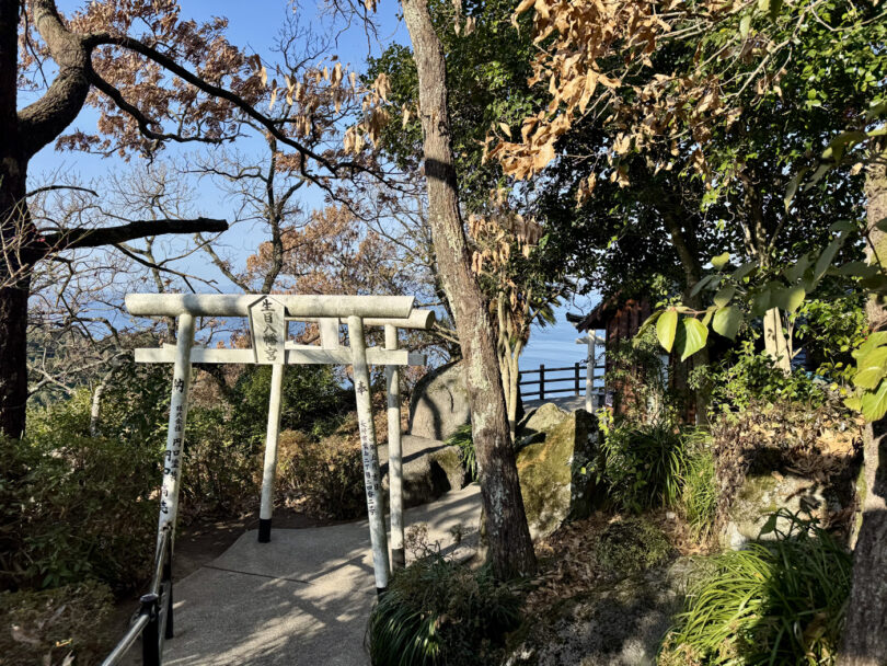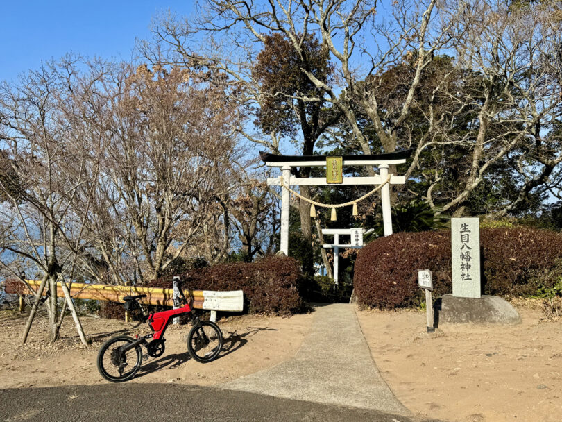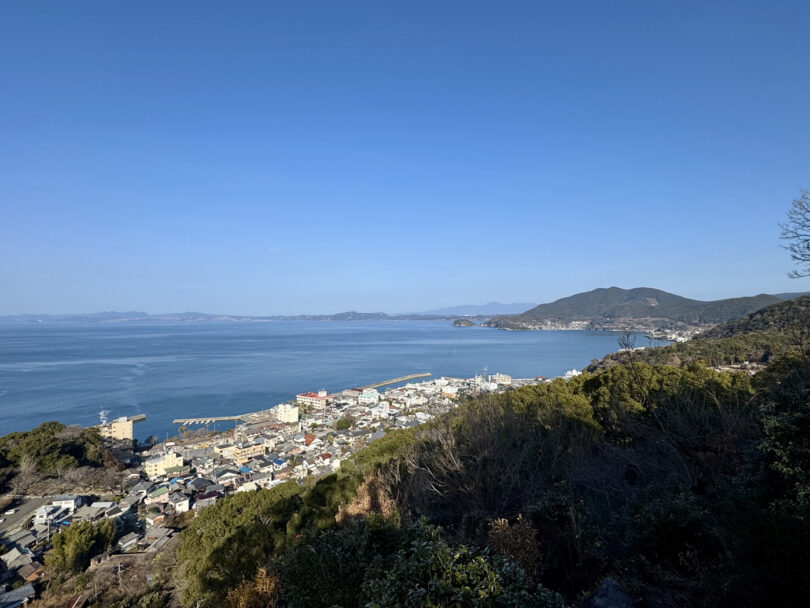山頂の生目(いくめ)八幡神社からは、橘湾や温泉街を一望できます。