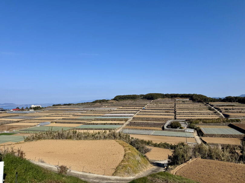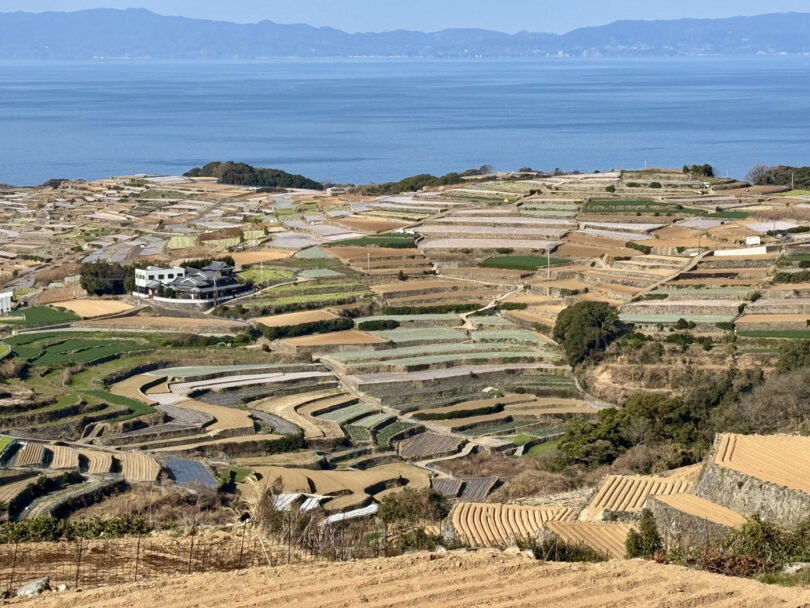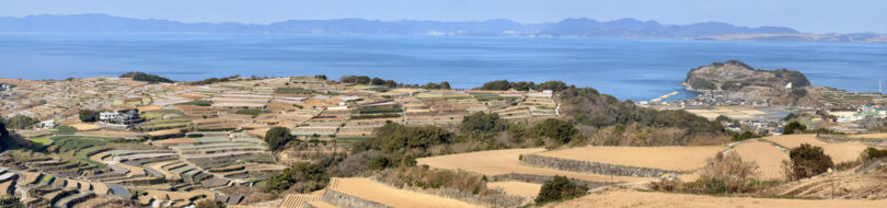 南串山棚畑展望台は、3.7mの展望台から、石垣で築かれた約800枚もの見事な棚畑(段々畑)と橘湾のコントラストを一望できる「長崎県だんだん畑10選」の絶景スポット。畑では主にじゃがいもやレタスが生産されています。