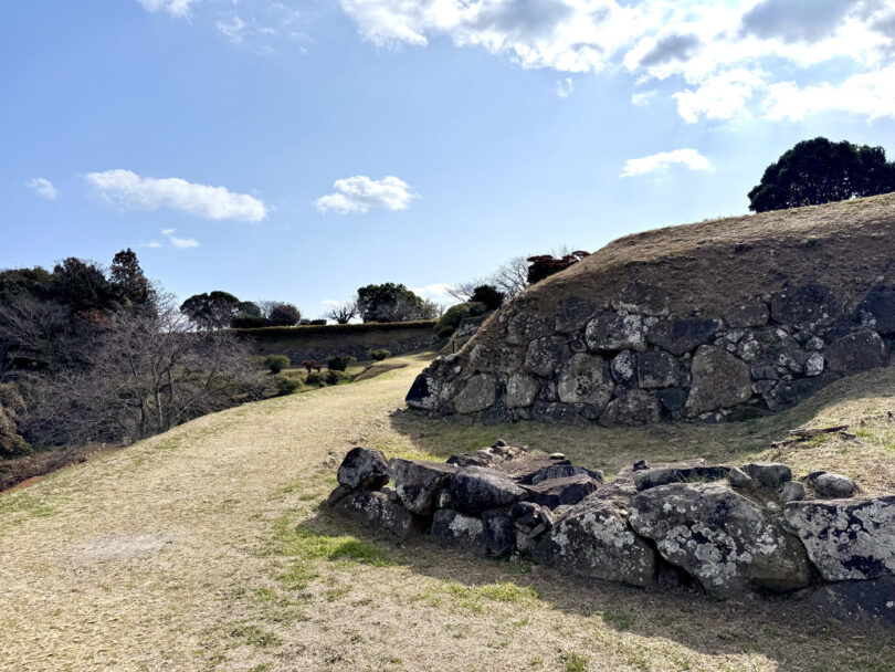 原城は幕府軍により徹底的に破壊されたため、本丸跡からは埋められた石垣が発掘されています。史跡内に駐車場はないので、散策には自転車がとても便利です。