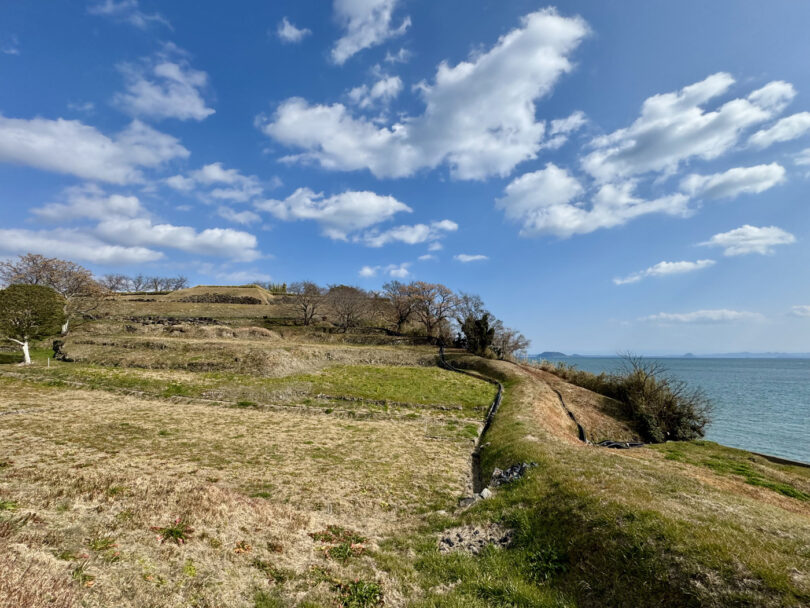一帯は約9万年前に起こった阿蘇火山の大噴火による火砕流が堆積してできた小高い丘になっていて、海沿いの散策路や高台にある本丸跡からは有明海に浮かぶ湯島や天草の島々を眺めることができます。