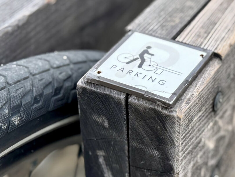 自転車道各所に配置されているベンチは、自転車スタンドの機能も備わっています。
