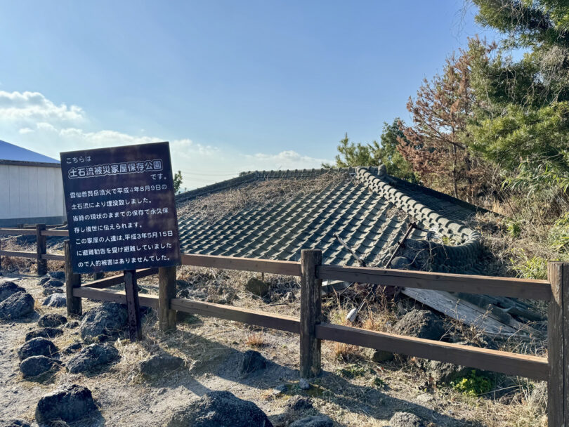 土石流被災家屋保存公園は、雲仙普賢岳噴火に伴う土石流で埋没・被災した家屋を当時のままの姿で保存・公開している施設です。平均約2.8m埋没した家屋が、屋外と大型テント内に展示されていて、災害のすさまじさをリアルに感じることができます。