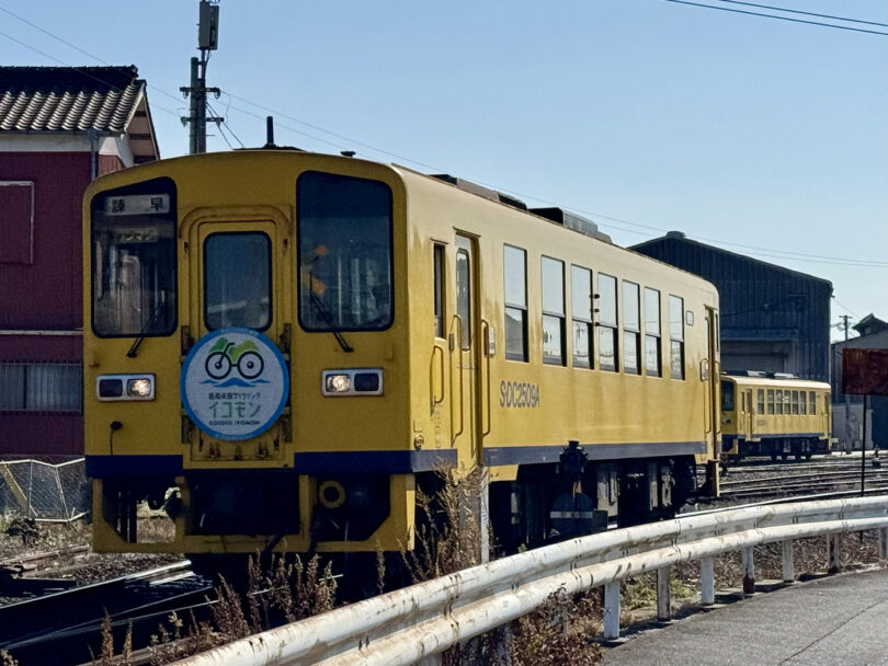 浜の川湧水観光交流館「銀水」から、島原鉄道を越えて海岸線へ。ちょうど通過した車両には「島原サイクリング イコモン」のヘッドマークが付いていました。