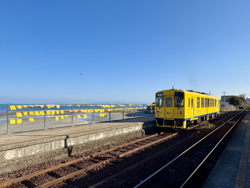 「日本一海に近い駅」の一つとして知られる無人駅のすぐ横には、有明海が広がる美しさだけでなく、願い事を書いて掲げる「黄色いハンカチ」の風景に出会えます。