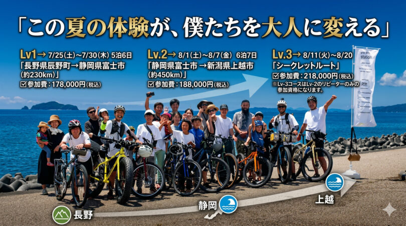 自転車冒険家・小口良平(※)のサポートのもと、日本の中心・長野県辰野町から、静岡県富士市の太平洋、また新潟県上越市の日本海を目指していきます。