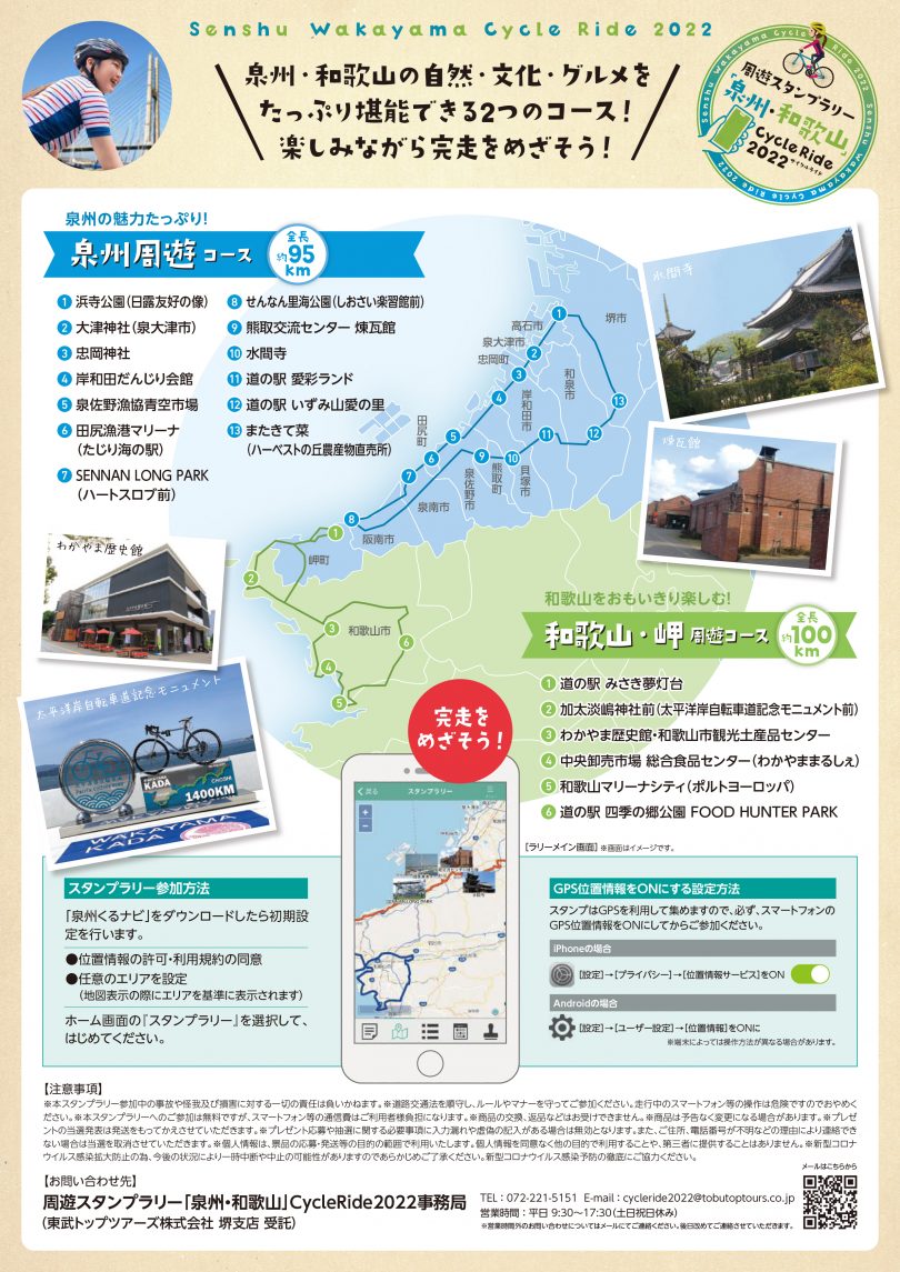 | 問い合わせ先 | 周遊スタンプラリー「泉州・和歌山」CycleRide2022事務局 (東武トップツアーズ株式会社 堺支店 受託) |