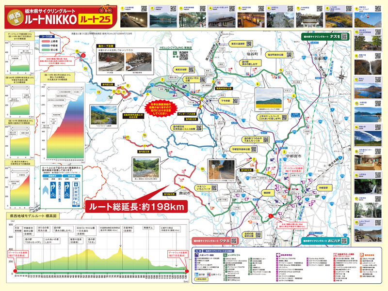 It is a model route with a total length of about 198 km that passes through 4 cities and towns in the western region of the prefecture and goes around majestic nature such as Mount Kogashiyama, Mount Nantai, Lake Chuzenji, and Senjogahara, and historical cultural heritage sites such as the world heritage site “Nikko's Shrines and Temples.” Enjoy premium cycling on slopes representative of this prefecture, such as Irohazaka and Furumegahara Kaido!