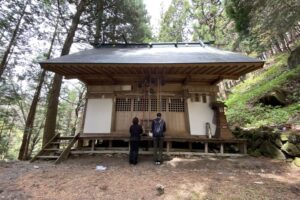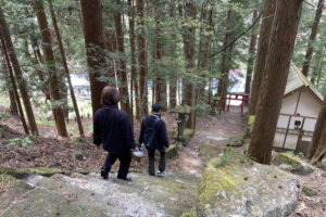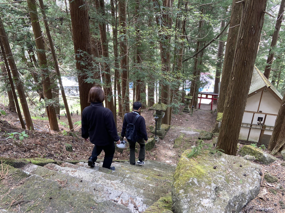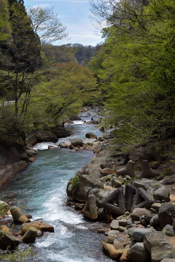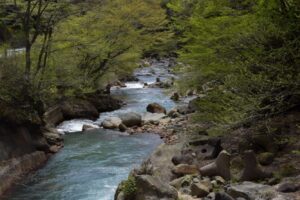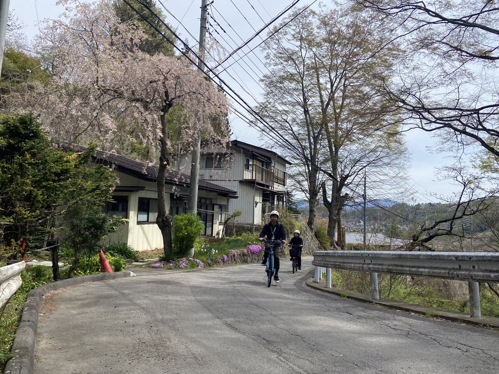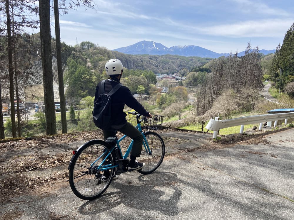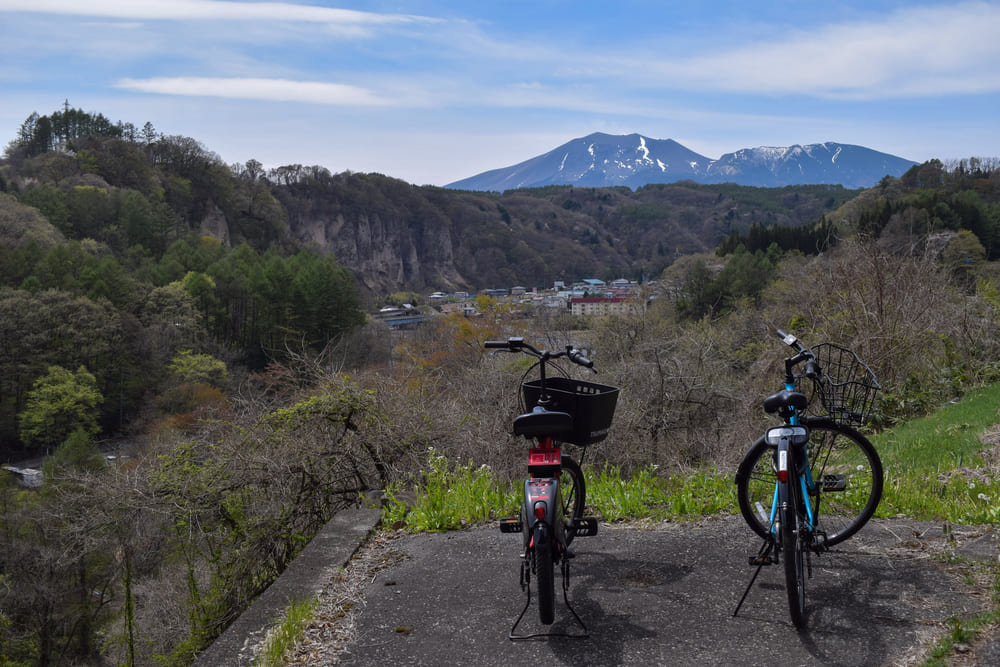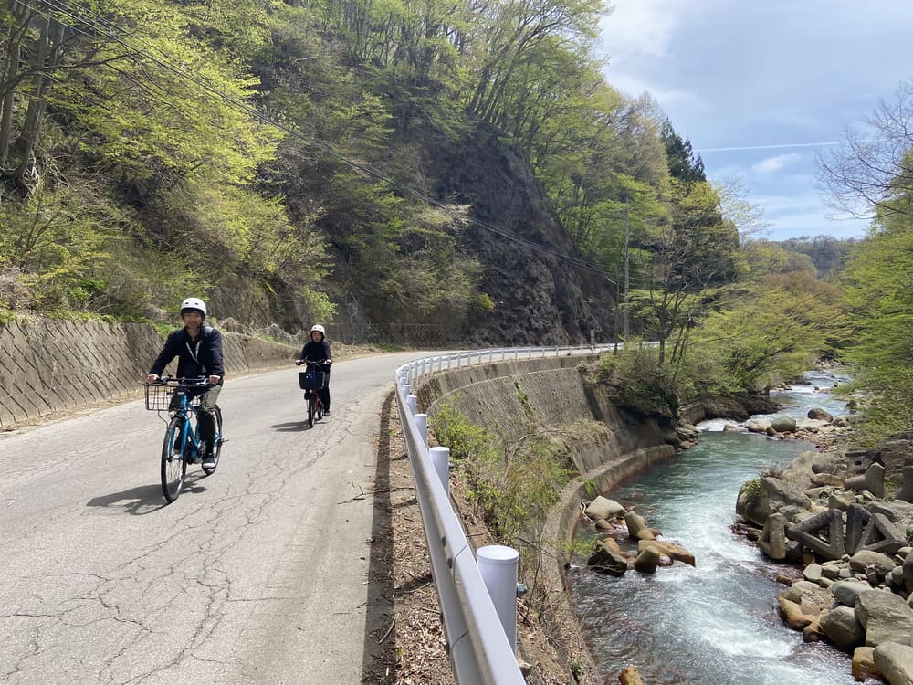 From the Tsumagoi Village Tourist Information Center, which sells rental bicycles, this course aims to Kumano Shrine, a mysterious spot in Tsumagoi Village where a large inverted cedar (Naruo Osugi) rises. The road along the mountain stream to Kumano Shrine has cool, cool air flowing even in summer, so you can enjoy comfortable cycling.