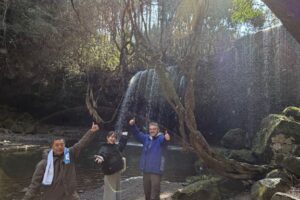 阿蘇のカルデラをつくった約9万年前の巨大噴火でできたとされる鍋ヶ滝。滝の落差は約10m、幅は約20m、カーテンのように幅広く落ちる水はとても優美で神秘的です。川のほとりで滝を間近に見ることができ、マイナスイオンを感じられる、心休まる癒しのスポットです。