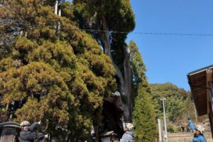 樹齢1300年以上と言われていて県下最大級の大杉として国の天然記念物に指定されています。幹の途中から十数本の大枝が立ち、その枝から無数の小枝にわかれており、小さな森のような姿をしていて、その様子が阿弥陀仏に見えることから「阿弥陀杉」と呼ばれるようになったと言われています。平成11年の台風18号によって全体の約3分の2が倒れる被害を受けましたが、倒れた枝部分は町図書館のあみだ杉の館にオブジェとして飾られています。