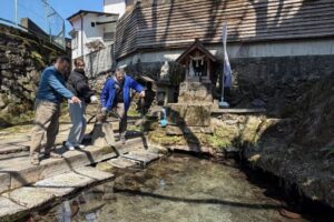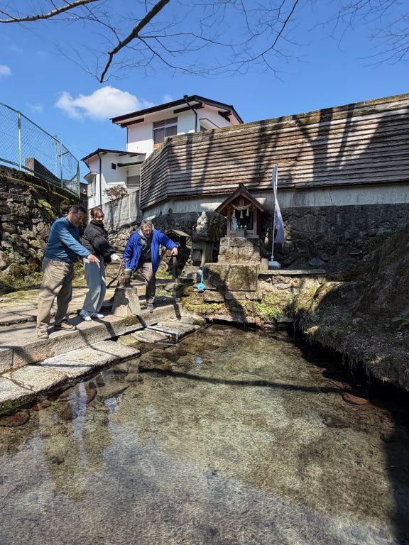 小国町宮原地域一帯は阿蘇溶岩の隙間から水が湧いているところです。その湧水の中心がこのけやき水源。湧き続ける湧水に、水の神がお祭りされています。江戸時代に、この水神様や小国両神社にお参りすることを日課にしていた橋本順左衛門が吉兆を感じ、富くじを買ったところ一番くじを当てたとの逸話がございます。その正夢の話を聞いた城尾村市郎右衛門は、水神様や両神社、鏡ヶ池の恵比寿様に一年以上も通い続け、富くじで一番くじを四回当てたとされており、その頃から、水神様は福運を呼ぶと信じられ、けやき水源はパワースポットとされています。