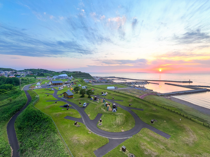 The campground on a hill next to the beach and the roadside station “Kaze W Tomamae” has beautiful views of Teuri Island, Yagishiri Island floating in the Sea of Japan, and Rishirifuji, and the sunset over the Sea of Japan creates a wonderful location.