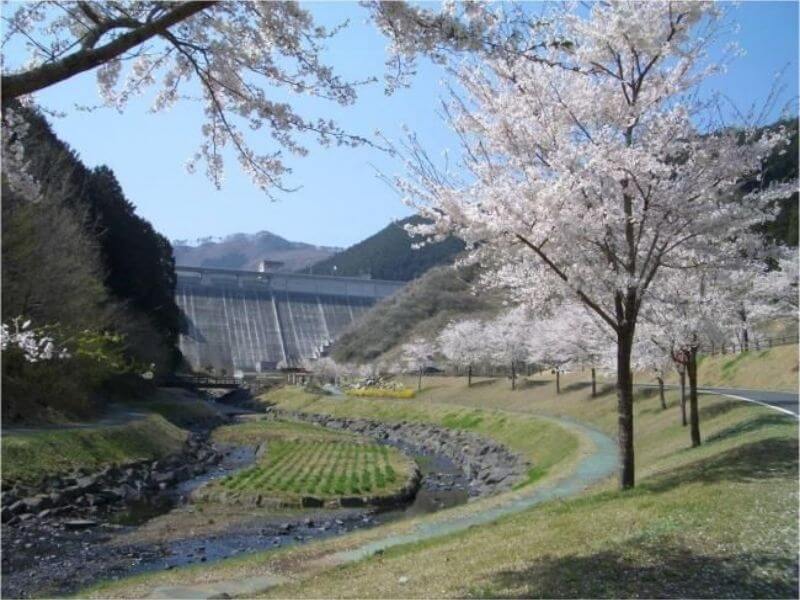 自然豊かな山間にあるダム。湖畔にはキャンプ場やバーベキュー場が整備されており、四季の景観とともにアウトドアを楽しめます。